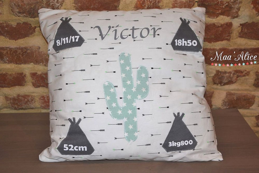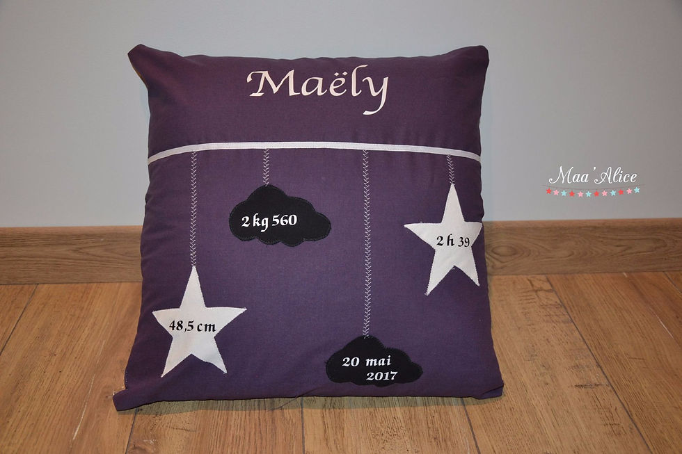 Les coussins de naissance sont réalisés en coton. Ils sont déhoussables et personnalisables.