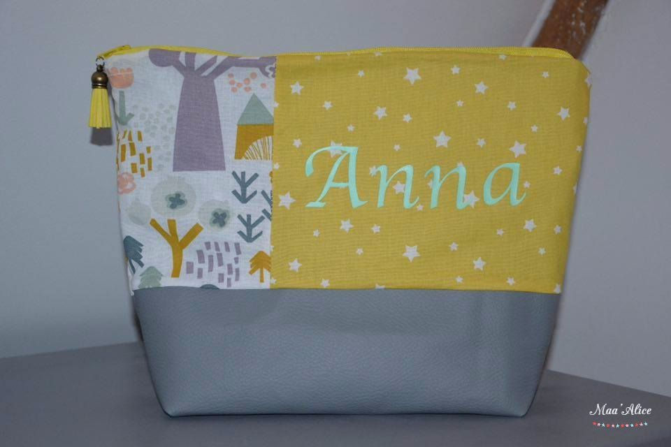 Les trousses de toilette sont réalisées en coton et simili cuir et doublées d'un tissu enduit à l'intérieur. Elles sont personnalisables.